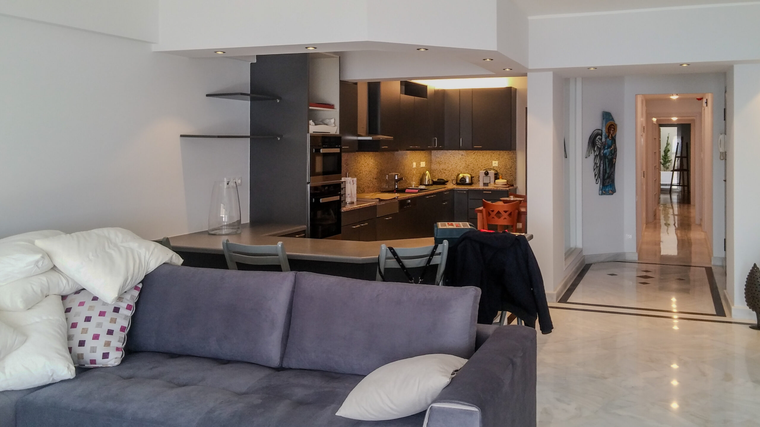 Ανακαίνιση διαμερίσματος με θέα στη θάλασσα, εστιάζοντας στη λειτουργικότητα και στη φυσική φωτεινότητα του χώρου. Η νέα διαρρύθμιση αναδεικνύει τη σύνδεση εσωτερικού/εξωτερικού και δημιουργεί ήρεμη ατμόσφαιρα με καθαρές γραμμές και ζεστά υλικά.